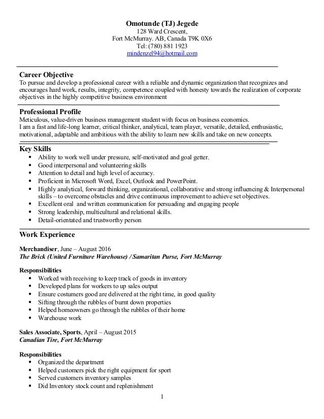 Canadian Tire resume sample I Canadian Tire resume sample A standard resume should includes parts as follows. Cashier Resume Sample Template As a cashier you will be working directly with customers to ensure that their shopping experience is good. Provide frontline support to Canadian Tire Dealers Parts Managers and Automotive Business Support Managers ABSMs in the execution of Automotive Assortments.